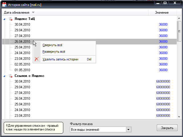 Для каждого сайта ведется история проверок, историю можно как просмотреть, так и удалить ненужные данные. Имеется функция оптимизации истории - используется если выключены опции ограничения проверок на один день. Т.е если включено разрешение проводить более одной проверки в 1 день - история может быть оптимизирована по критерию: удаляются лишние записи, остаются максимальные значения, сделанные в один и тот же день.