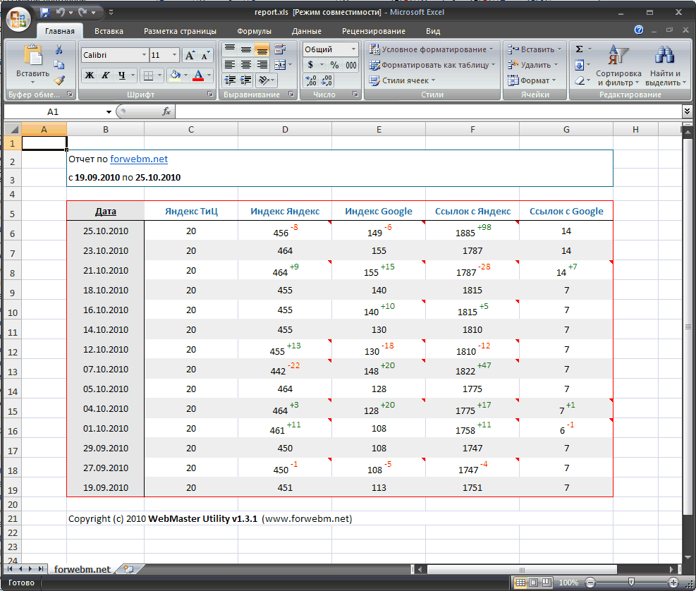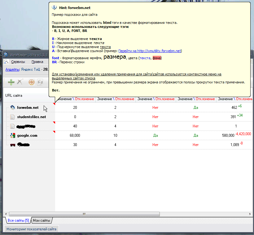 Описание возможностей:Инструмент предназначен для мониторинга изменений показателей сайта с течением времени. Позволяет отслеживать изменения (на данный момент 26) показателей.