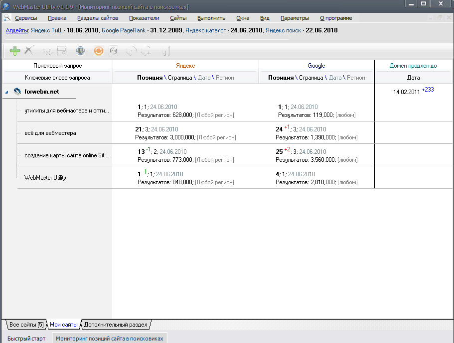 Описание возможностей: Сервис предоставляет возможность вести полноценное наблюдение и анализ позиций вашего сайта по указанным запросам в выбранных поисковиках. По умолчанию при первом запуске сервиса создаются 2 поисковика: Яндекс и Google. При необходимости нужный вам поисковик возможно добавить из меню "Показатели", на данный момент поддерживаются 7 поисковиков (Яндекс, Google, Rambler, Yahoo, Mail, Aport, Bing). (Если вам нужен другой поисковик - предложите, будет добавлен). Количество запросов для сайта не ограничено. Для каждого из запросов (также и для всех запросов сразу) можно назначить отдельно глубину просмотра и регион. Регионы по умолчанию при первом создании импортируются автоматически, при ручном создании поисковика предоставляется возможность выполнить импорт регионов с необходимых поисковиков или создать список регионов самостоятельно. Глубина проверки не ограничена, по умолчанию глубина просмотра выставляется в 30 результатов. Данные о проверки позиций отображаются визуально с отклонениями как позиций, так и страниц в выдаче. По умолчанию используется отклонение как есть: при увеличении позиции (падении) идет положительное отклонение, при уменьшении (приближении к первой) отрицательное отклонение - знак отклонения возможно поменять местами в настройках сервиса. Имеется возможность объединения сайтов с WWW и без. Как известно сайт с WWW имеет совершенно другие позиции, нежели сайт без WWW. Если необходимо выполнять проверку без учета WWW - данную опцию возможно включить в настройках сервиса, в таком случае, сайт в результатах выдачи поисковика будет определяться независимо от наличия WWW. Запросы могут быть составлены из любых символов, ограничений нет, данные передаются поисковикам в их привычной форме, формат UTF8. Сайты также могут быть абсолютно произвольные, поддержка сайтов на кириллице (например: президент.рф) доступна в полном объеме. Для анализа позиций в Яндекс предоставляется возможность использования Яндекс.XML - для включения данной поддержки необходимо указать ключ Яндекс.XML в настройках программы. Предоставляется мощная обработка ситуации "Вы робот?" при выполнении слишком частых запросов к поисковикам без использования XML или прокси серверов. На данный момент поддерживается обработка таких ситуаций в поисковиках Яндекс и Google (если такая ситуация у вас возникает в других поисковиках - опишите ситуацию - будет добавлено!). Обработка данной ситуации происходит с !вашим! участием - при возникновении такой ситуации сервис вызовет окно уведомления (с звуковым уведомлением) и предоставит вам текст каптчи для ввода, при этом приостановит выполнение, после ввода кода с картинки - продолжит выполнение. Любые данные по проверки сервис предоставляет возможность просмотреть непосредственно в поисковике вручную. Из контекстного меню предоставляется возможность посмотреть позицию вашего сайта по выбранному запросу в результатах выдачи поисковика, при этом предоставит вам ссылку для просмотра непосредственно на ту страницу выдачи, на которой располагается ваш сайт (при использовании Яндекс.XML просмотр результатов также возможен!). Все анализы позиций запросов сайта сохраняются и предоставляются в виде истории проверок. Историю возможно оптимизировать на дубликаты проверок, просмотреть в виде общего списка просмотра, 
