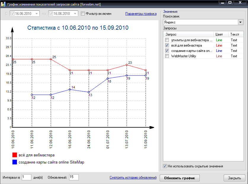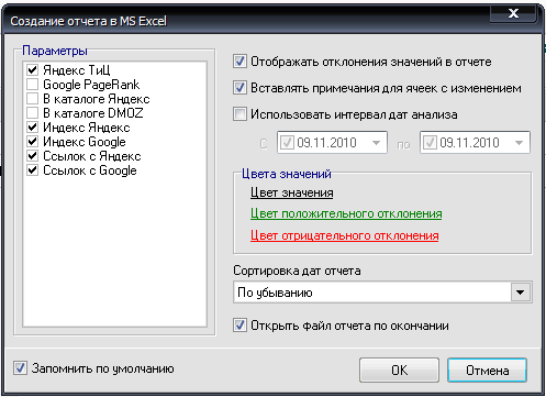 Предоставляется возможность создавать подробный отчет по выбранному сайту в Excel. Отчет формируется по выбранным параметрам и выбранным поисковикам. При создании отчета - каждый из запросов у сайта будет иметь свой собственный отчет, размещенный на отдельном листе Excel. ![]() Список сайтов возможно разделять на группы (разделы). Количество разделов не ограничено. Любой сайт может быть привязан к нескольким разделам. При удалении раздела - сайты в этом разделе не удаляются, удаляется только ссылка на раздел. Помимо поисковиков, в сервис возможно добавлять стандартные показатели (такие как Яндекс ТИЦ, Индекс и т.д). История по стандартным показателям не ведется!. Показатели (поисковики, значения) возможно перемещать в списке/изменять размеры колонок и т.д. Все изминения сохраняются. Предоставляется возможность использовать неограниченный список прокси серверов. Прокси могут быть: http, socks4, socks5 типов. Метод выборки и время выборки прокси возможно настроить в настройках сервиса. Возможно выполнять обновление данных по запросам для указанных параметров: Выполнять обновление показателей только для указанных сайтов, поисковиков, параметров и т.д. ------------ Если вы считаете, что чего-то не хватает? Буду признателен за пожелание по улучшению/пополнению функциональности. По любому вопросу вы можете обратиться оставив комментарий или через форму обратной связи.