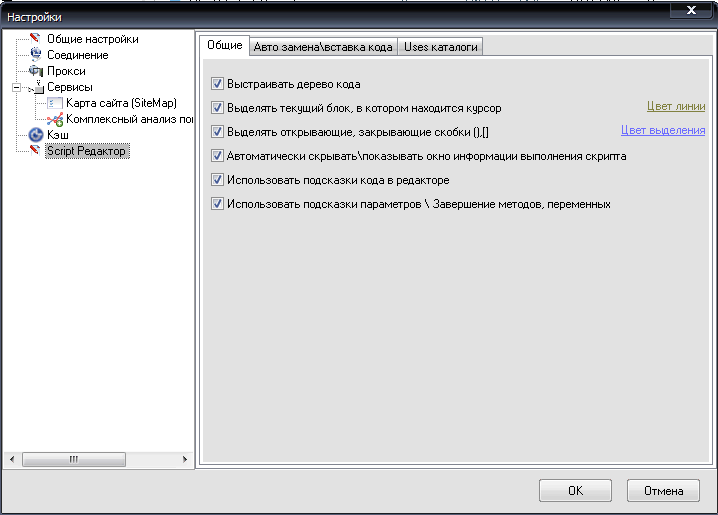 Выстраивать дерево кода - если флажок установлен при редактировании кода скрипта, автоматически будет выстраиваться дерево объектов кода.