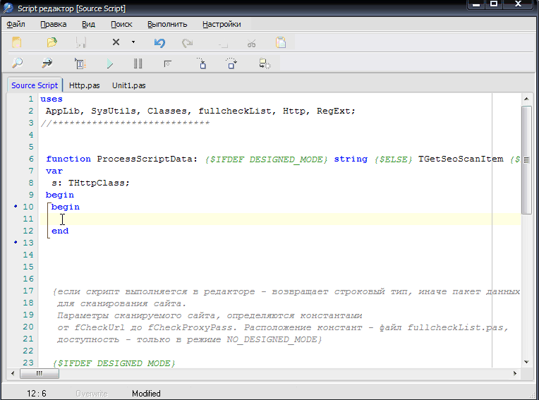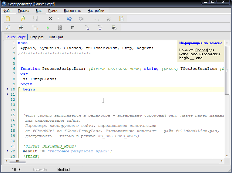 Автоматически скрывать\показывать окно информации выполнения скрипта - если флажок установлен, окно информации выполнения скрипта будет автоматически показываться при возникновении ошибки и\или сообщения и скрываться при полностью безошибочном выполнении\компеляции\написании кода.