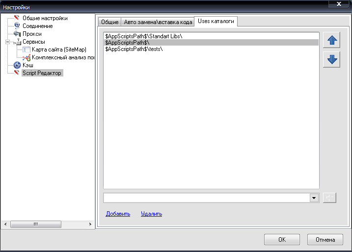 Определяет список каталогов, в которых выполнять поиск подключаемых к скрипту юнитов. Приоритетность каталогов определяется позицией в списке uses каталогов. Параметр