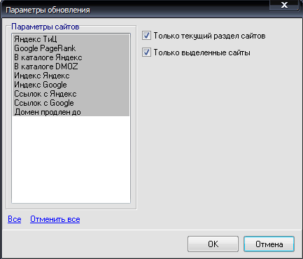 - Особые параметры обновления - Позволяет выбрать все или отдельные как сайты, так и параметры сайтов для обновления.