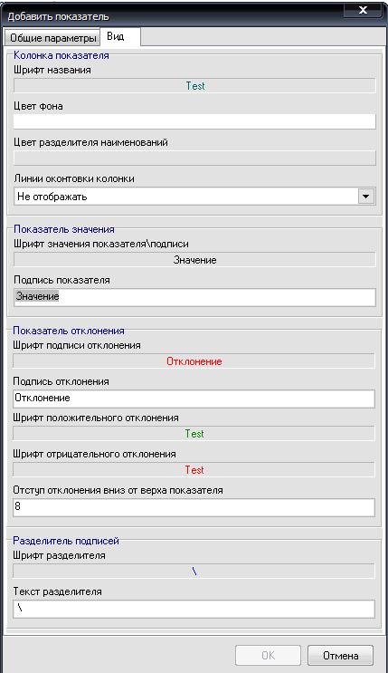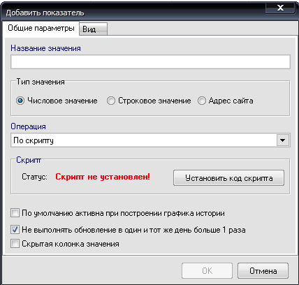 Вкладка "Общие параметры" определяет параметры показателя, вкладка "Вид" - вид вкладки в таблице сайтов, варианты отображения показателей и отклонений значений.