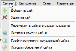 - Обновление - Позволяет выполнять обновление показателей сайта, сайтов