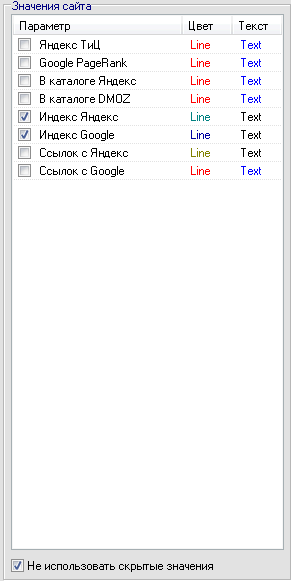 Если флажок "Не использовать скрытые значения" установлен - параметры сайта, скрытые в таблице не будут использоваться при построении графика. Для задания параметров списка используется меню "правой кнопки мыши".