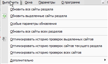 Меню "Выполнить" предоставляет доступ к выполнению Обновления, Оптимизации, Кэширования истории сайта.