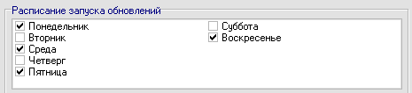 Определяет дополнительный период простоя WebMaster Utility Monitor. При снятии всех флажков с дней недели, используется как основной промежуток дней простоя с даты последней успешной проверки. При указанных параметрах дней недели - используется как дополнительный счетчик простоя. (пример: При указании обновлений в Четверг и Субботу, если указать данный параметр в 3 дня - обновление будет выполнено в четверг и в субботу следующей недели, поскольку разница между указанными днями недели меньше данного параметра.