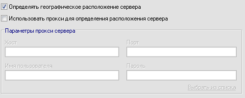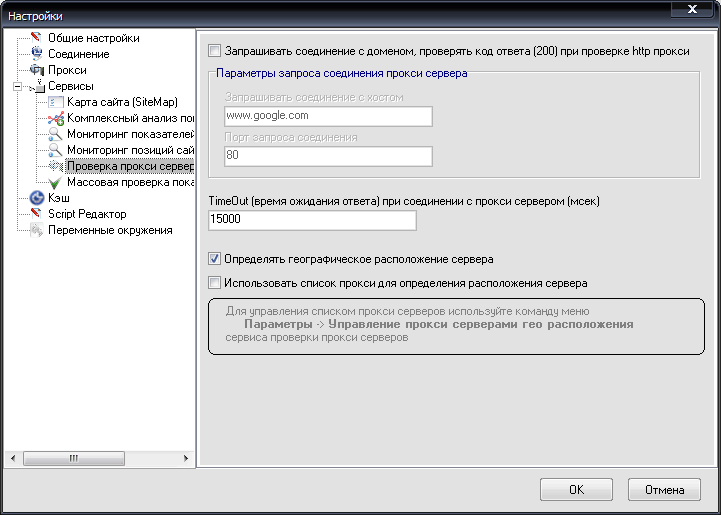 Определяет параметры определения географического расположения проверяемого прокси сервера. Данную опцию можно как отключить, так и указать прокси сервер для определения географического расположения прокси сервера.
