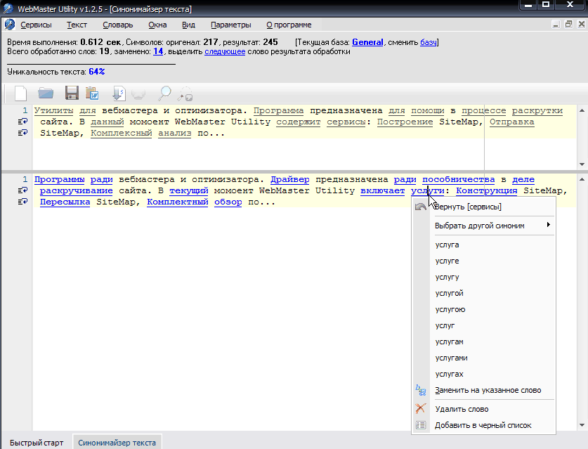 Возможности сервиса "Синонимайзер текста":
