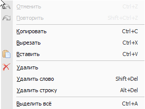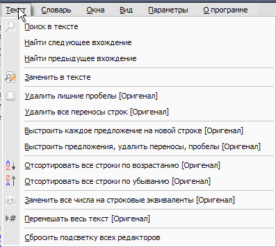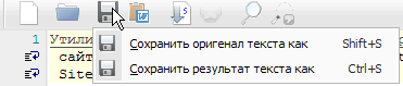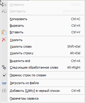 Контекстное меню обоих редакторов текста (как оригинала, так и результата) практически одинаковое. Разницей выступают только единичные, специфичные для редактора команды. (к примеру: Загрузить из файла для оригинала текста).