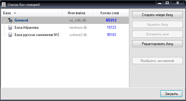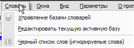Для управления базами используется меню "Словарь".