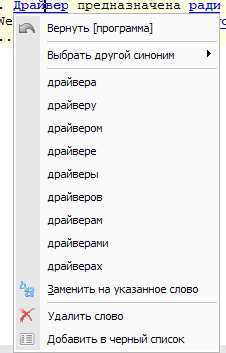 Меню отображается, если количество синонимов для данного слова больше одного. Меню содержит список всех возможных синонимов для текущего слова, кроме текуще замененного. Если список синонимов слишком большой, обрезает для видимого выбора и предоставляет возможность выбора из общего списка. После выбора слова, слово автоматически трансформируется в форму текущего (пример: исходное слово (по курсором): ХОДИТЬ, после выбора например слова ИДУТ, слово автоматически будет преобразовано в форму ИДТИ и т.д). После замены сохраняет возможность редактирования уже нового слова.