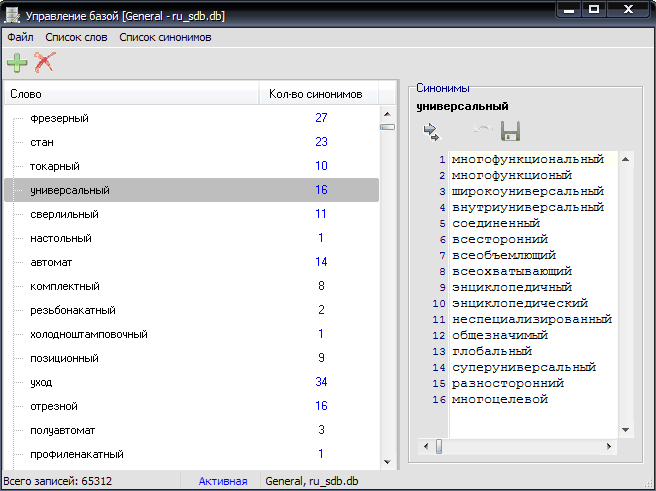 Для вывода списка синонимов слова нужно: дважды кликнуть левой кнопкой мыши по выбранному слову, или нажать Enter выделив слово, также из контекстного меню списка. После вывода списка синонимов редактируемое слово сохраняется даже если выделяются другие слова списка. Для того, чтоб добавить к синонимам выделенные слова списка, необходимо выделив слова нажать сочетание клавиш (Ctrl+Right) и все выделенные слова автоматически будут добавлены к синонимам текущего активированного слова. Для сохранения списка синонимов редактируемого слова используется команда или клавиша F2.