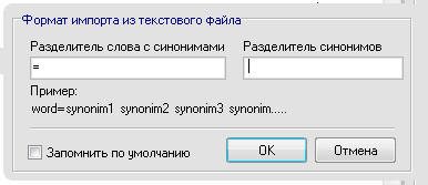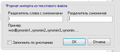 В данном окне указываются разделители слова и синонимов, а также самих синонимов между собой. Если разделитель(и) будут пробелами, они не смогут быть сохранены "по умолчанию", следовательно если в файле есть разделитель "пробел", указав пробел в качестве разделителя, желательно убирать галочку "Запомнить по умолчанию". Размер файла может быть практически любым. При импорте не выполняется полная загрузка файла, чтение построчное. Текстовый файл должен быть в кодировке ANSI.