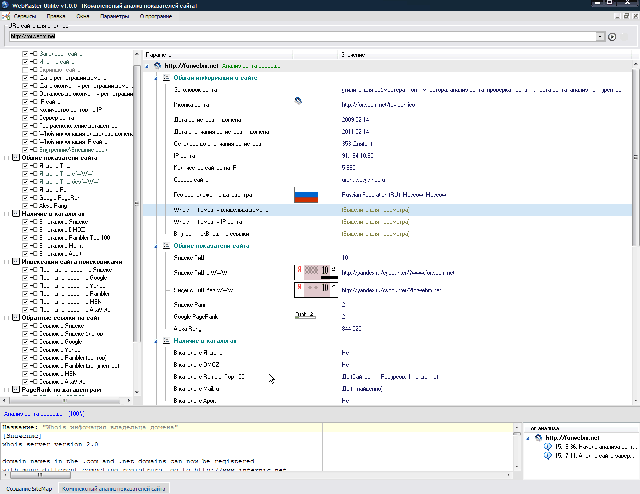 Сервис комплексного анализа показателей сайта позволяет получить основные параметры сайта в сети.