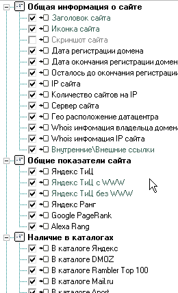 Список основных проверяемых параметров сайта, по умолчанию имеющихся в сервисе:
