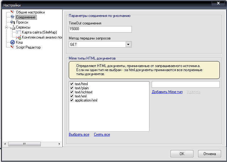Определяет список разрешенных типов html страниц в сети. (если список пуст, либо сняты все галочки) - будут доступны все типы документов.
