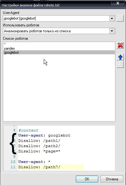 Правило позволяет установить список роботов, учет которых будет вестись при анализе запрета индексации при обходе сайта.