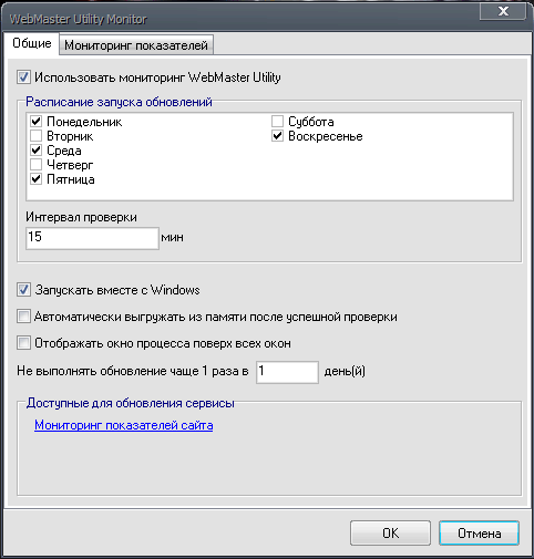 WebMaster Utility Monitor позволяет не тратить время на постоянное обновление показателей сайтов в сервисах программы. С использованием WebMaster Utility Monitor обновление сайтов происходит в одинаковом режиме, что и через саму программы, но в каротковременном режиме. Приложение WebMaster Utility запускается в фоновом режиме только на время выполнения обновлений и полностью контролируется приложением WebMaster Utility Monitor. Указав необходимые параметры обновлений, WebMaster Utility потребуется только для просмотра результатов сервисов, ведение отчетов и статистики тех сервисов, которые требуют постоянного обновления для отображения результатов.