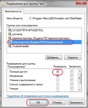 После выполнения процесса установки на системе, например Windows 7 для корректной работы программы требуется разрешить программе запись на некоторые каталоги, из состава программы WebMaster Utility, это: