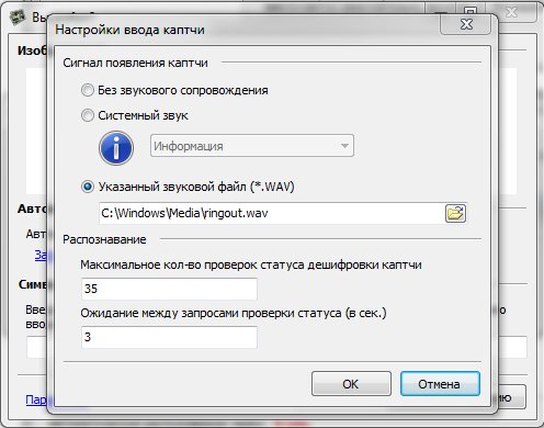 Настройки уведомления о появлении каптчи (например звуковой сигнал и т.д) Вы можете настроить непосредственно в окне каптчи.
