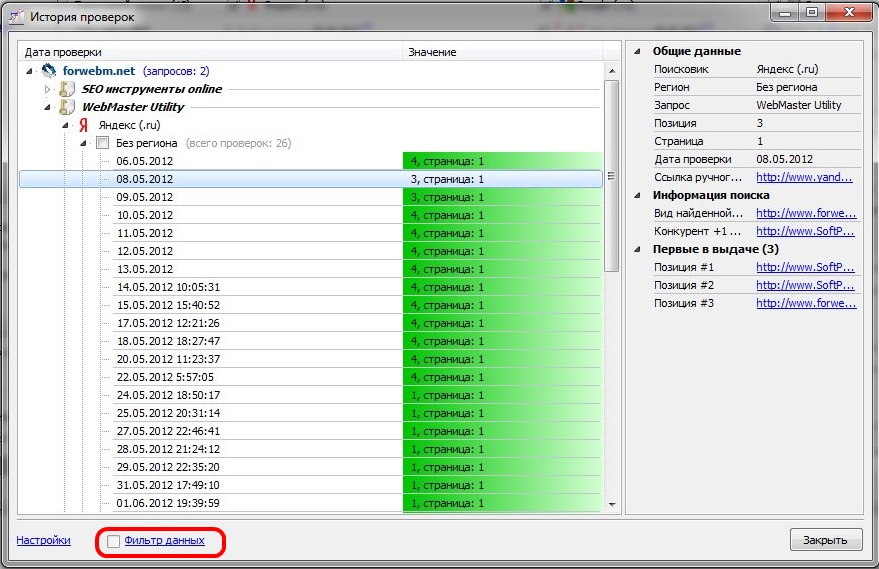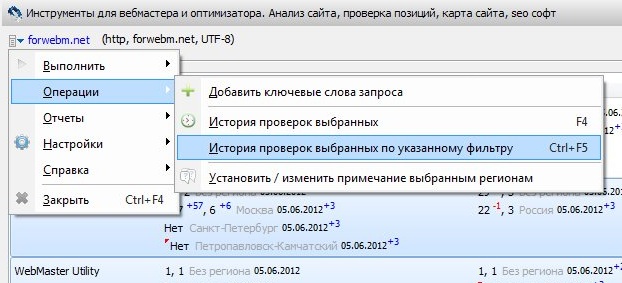 Фильтры проверок используются в истории проверок и задаются из соответствующего окна программы, однако Вы можете не открывая истории (т.е не загружая все данные проверок) выбрать нужные фильтры для загрузки истории, что значительно сэкономит время при большом кол-ве проверок (если на протяжении большого кол-ва времени с определенной периодичность выполнялась проверка по большому кол-ву запросов группы). Открыть историю с активными фильтрами вы можете из меню `Операции` инструмента: