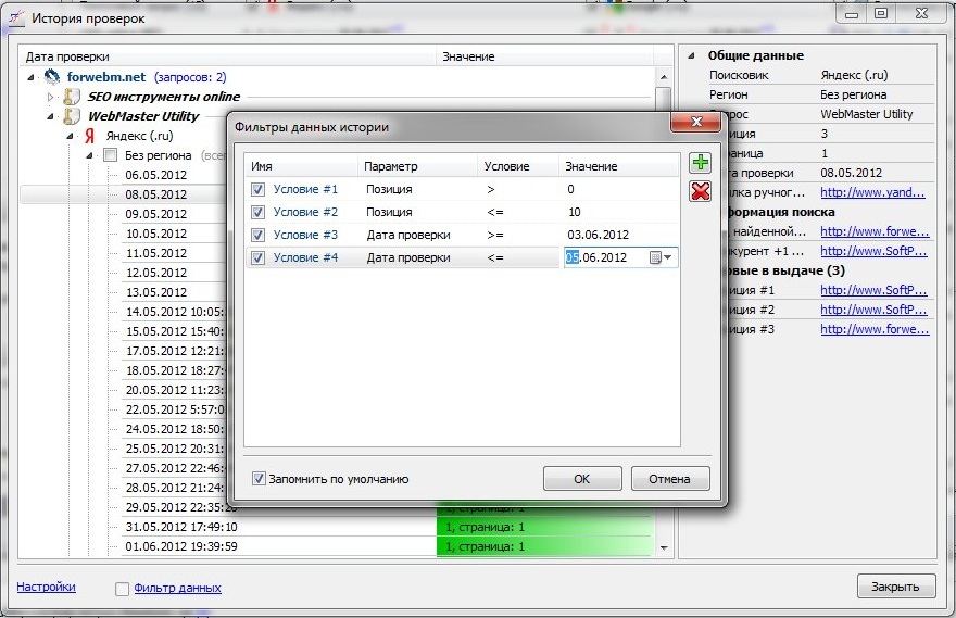 Инструмент (приложение) `Анализ и мониторинг позиций сайта` позволяет определить критерии просмотра ранее сделанных проверок. Данные фильтры могут быть использованы например в ситуации, когда Вам необходимо посмотреть, проанализировать данные по снятию позиций за определенный период времени (и возможно с определенным диапазоном значений позиций).