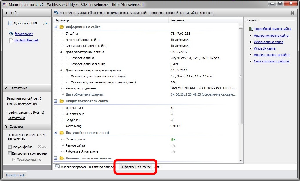 Данный раздел обновляется автоматически 1 раз в 3 дня при общем съеме позиций. Предоставляет общую информацию о сайте, такую как: данные whois, индексацию сайта, наличие сайта в каталогах, обратные ссылки с поисковиков, ТиЦ, пр и т.д