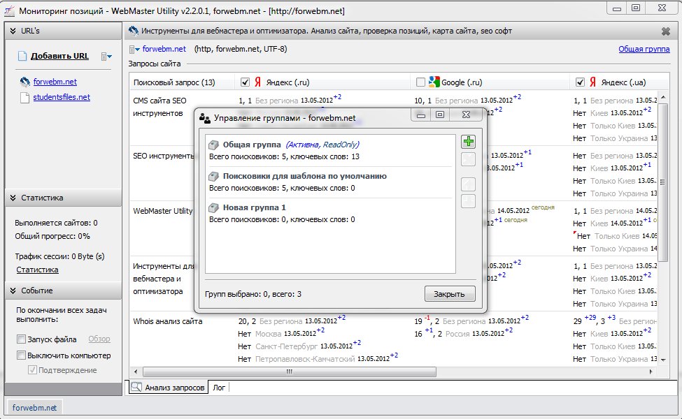 Инструмент (приложение) `Анализ и мониторинг позиций сайта` позволяет для каждого сайта использовать неограниченное кол-во групп запросов. Использование групп позволяет использовать совершенно разные как запросы, так и поисковики для обработки позиций сайта. Для каждой группы создаются отдельно поисковики (как правило их проще импортировать из файла, например экспортированного из `Общей группы` или например скаченного с сайта программы), ключевые слова также используются совершенно другие по отношению к другим группам.