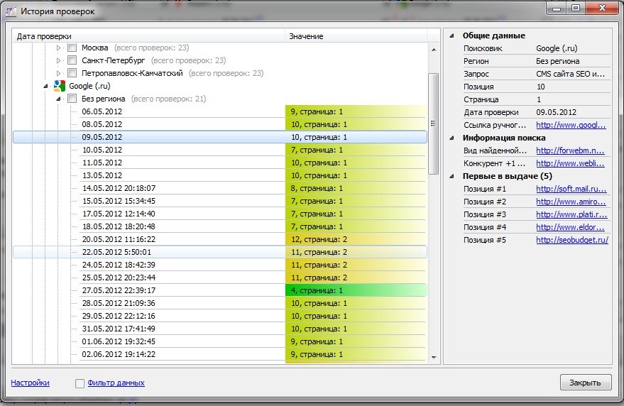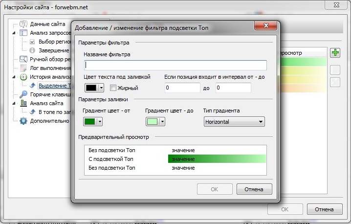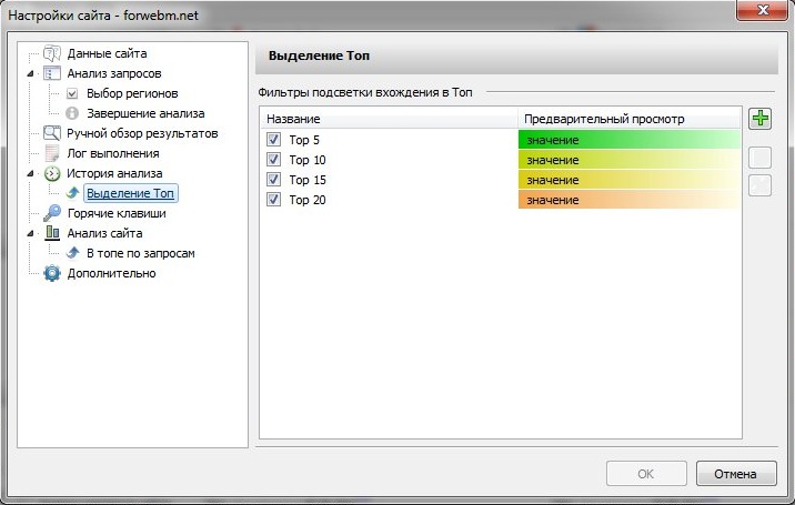 Инструмент (приложение) `Анализ и мониторинг позиций сайта` позволяет подсвечивать указанное вхождение в топ. Список фильтров, по которым выполняется проверка составляется динамически, в настройках сайта и может содержать неограниченное кол-во фильтров. Цвета указываются с использованием градиентной заливки. Данная функция позволяет просматривать плавное изменение позиций запросов в течении указанного периода времени.
