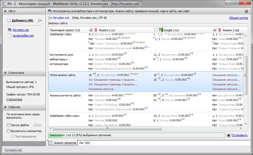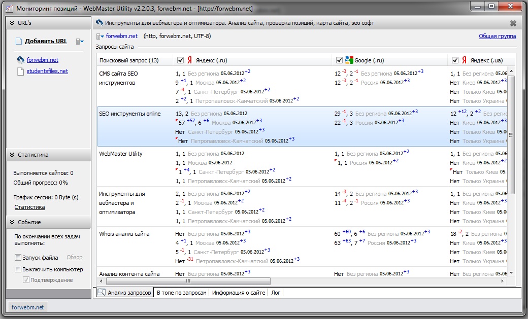 Приложение (инструмент) `Анализ и мониторинг позиций сайта` предназначен для анализа и мониторинга изменений позиций Вашего сайта (или сайтов). Инструмент позволяет вести историю изменений позиций с последующим просмотром как списка проверки (по конкретным дням или дням с указанием времени), так и просматривать общую динамику изменений на графике. Любые данные возможно экспортировать в виде отчета (как стандарт Excel документ, так и html файл с текущим состоянием данных проверки)