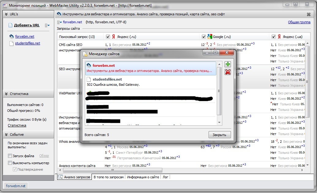 Менеджер проектов (сайтов) в инструменте `Анализ и мониторинг позиций сайта` позволяет управлять добавленными в инструмент на обработку и мониторинг сайтами.