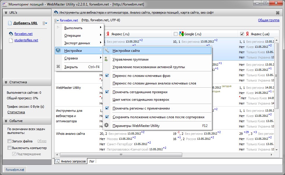 Настройки в инструменте (приложении) `Анализ и мониторинг позиций сайта` для каждого сайта (проекта) задаются персонально. Каждый сайт может быть настроен по своему. Доступ к настройкам сайта выполняется из главного меню интерфейса управления сайтом.