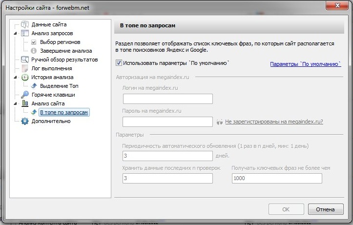 Данный раздел предоставляет возможность просмотра ключевых фраз, по которым Ваш сайт находится в соответствующих Топ основных поисковиков и другую информацию по данным запросам. Данные для этого раздела предоставляются от megaindex, для настройки раздела необходимо указать логин и пароль от сайта www.megaindex.ru. Настройка раздела `В топе по запросам` выполняется в настройках сайта: