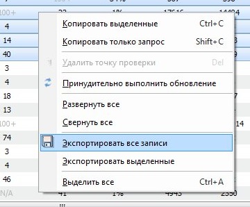 Для управления списком, а также экспортировании данных используется контекстное меню списка.