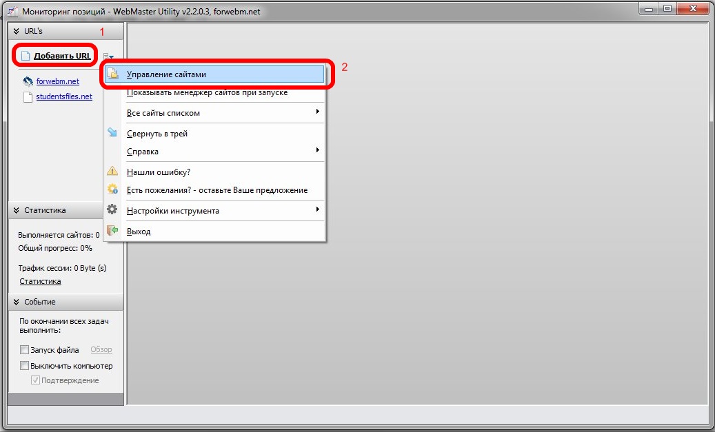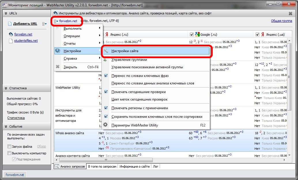 После этого предварительная (под общие параметры) настройка проекта (сайта) завершена и Вы можете добавить нужные запросы (если не сделали этого ранее) и приступать к работе.