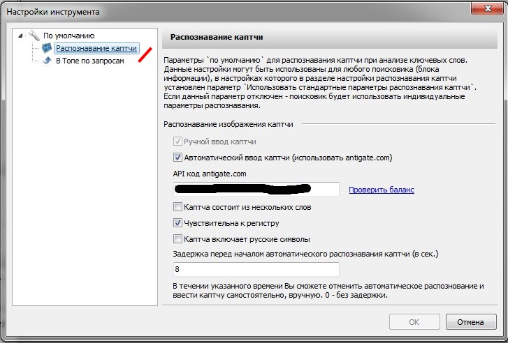 1). Если вы желаете подключить antigate.com для автоматического распознавания каптчи, в ситуации, когда таковую будет выдавать поисковик - Вы можете сделать это 1 раз для всех сайтов инструмента в общих настройках. Если Вам необходимо указать персональные данные для каждого поисковика (например разные аккаунты на antigate) - можете сделать это позже, по умолчанию все поисковики наследуют данные настройки от глобальных.