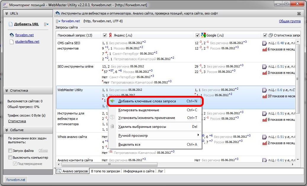 Добавить поисковые запросы для анализа вы можете из контекстного меню списка запросов: