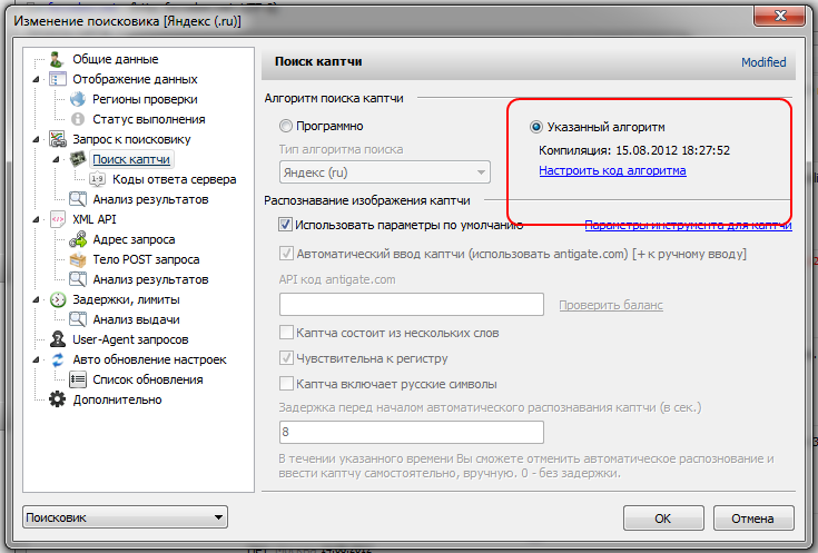 Для установки в инструменте `Анализ и мониторинг позиций сайта` собственного алгоритма поиска и распознавания каптчи на страницах выдачи поисковика необходимо установить соответствующий скрипт в настройках поисковика на вкладке `Запрос к поисковику - Поиск каптчи`