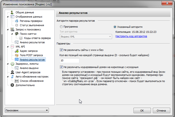 Для установки в инструменте `Анализ и мониторинг позиций сайта` собственного алгоритма парсинга контента страниц выдачи поисковика и получения позиций от поисковика необходимо установить соответствующий скрипт в настройках поисковика на вкладках: