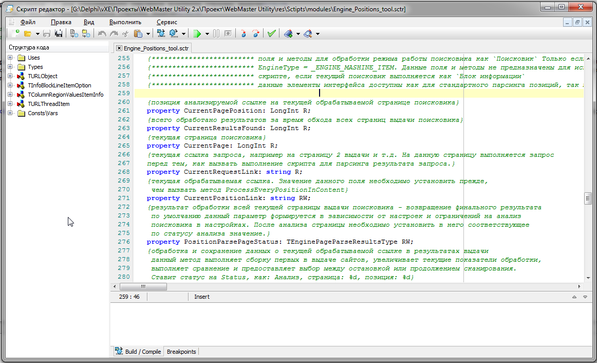 За работу инструмента `Анализ и мониторинг позиций сайта` в скрипте (за предоставление доступа к элементам инструмента) отвечает модуль `Engine_Positions_tool.sctr`, который располагается в каталоге `\res\Sctipts\modules\`. Данный модуль снабжен подробными комментариями описания всех полей, которые возвращает или принимает объект доступа к инструменту во время выполнения скрипта и инструмента. В модуле определена переменная ThreadParserItem: TURLThreadItem;, которая инициализируется автоматически и предоставляет доступ к инструменту в скрипте.