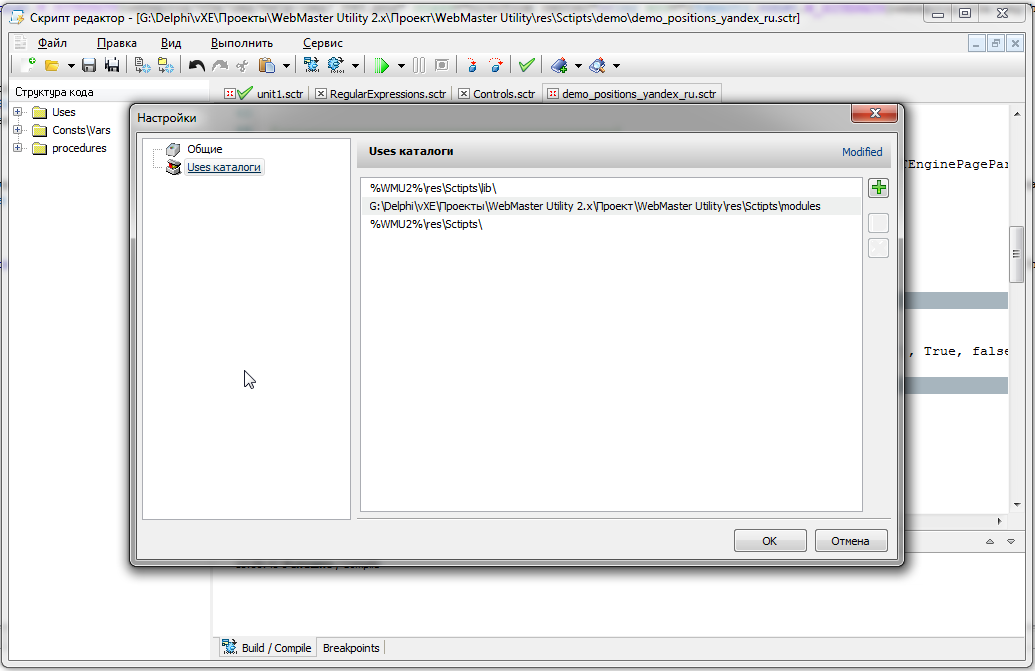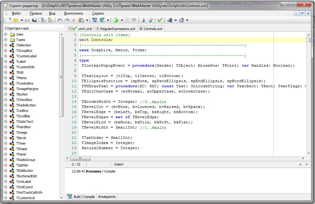 Редактор скрипта приложения WebMaster Utility представляет собой полноценный программный продукт, ориентированный на разработку и тестирования кода, написанного на скрипте языка Pascal.