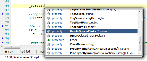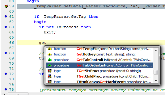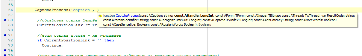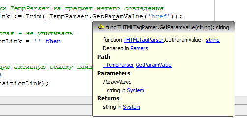 ![]() ![]() - подсказка вводимых параметров метода, процедурного типа, поля класса и т.д