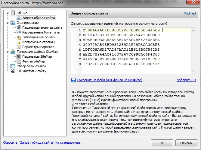 После того, как нужный список идентификаторов построен - его необходимо сохранить в файл, для этого потребуется нажать ссылку `Сохранить в файл`. После нажатия данной ссылки - имя файла будет выставлено автоматически, изменять его не следует - приложение SiteMap генератор будет выполнять поиск именно этого файла (с таким именем) и никакого другого.