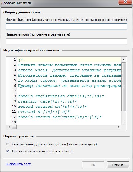 Приложение (инструмент) Whois позволяет создать пользовательские поля, которые необходимо извлекать из данных, полученных от Whois сервера. Данные поля создаются в настройках инструмента в разделе `Поля данных Whois`
