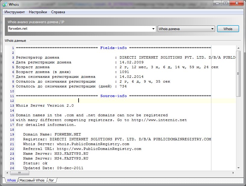 Приложение (инструмент) Whois позволяет получать и обрабатывать Whois данные домена и/или IP сайта. Полученные данные предоставляется возможность обрабатывать по указанному критерию (например извлекать из данных, полученных от Whois сервера какие-либо определенные данные, например дату регистрации домена или e-mail владельца домена и т.д)